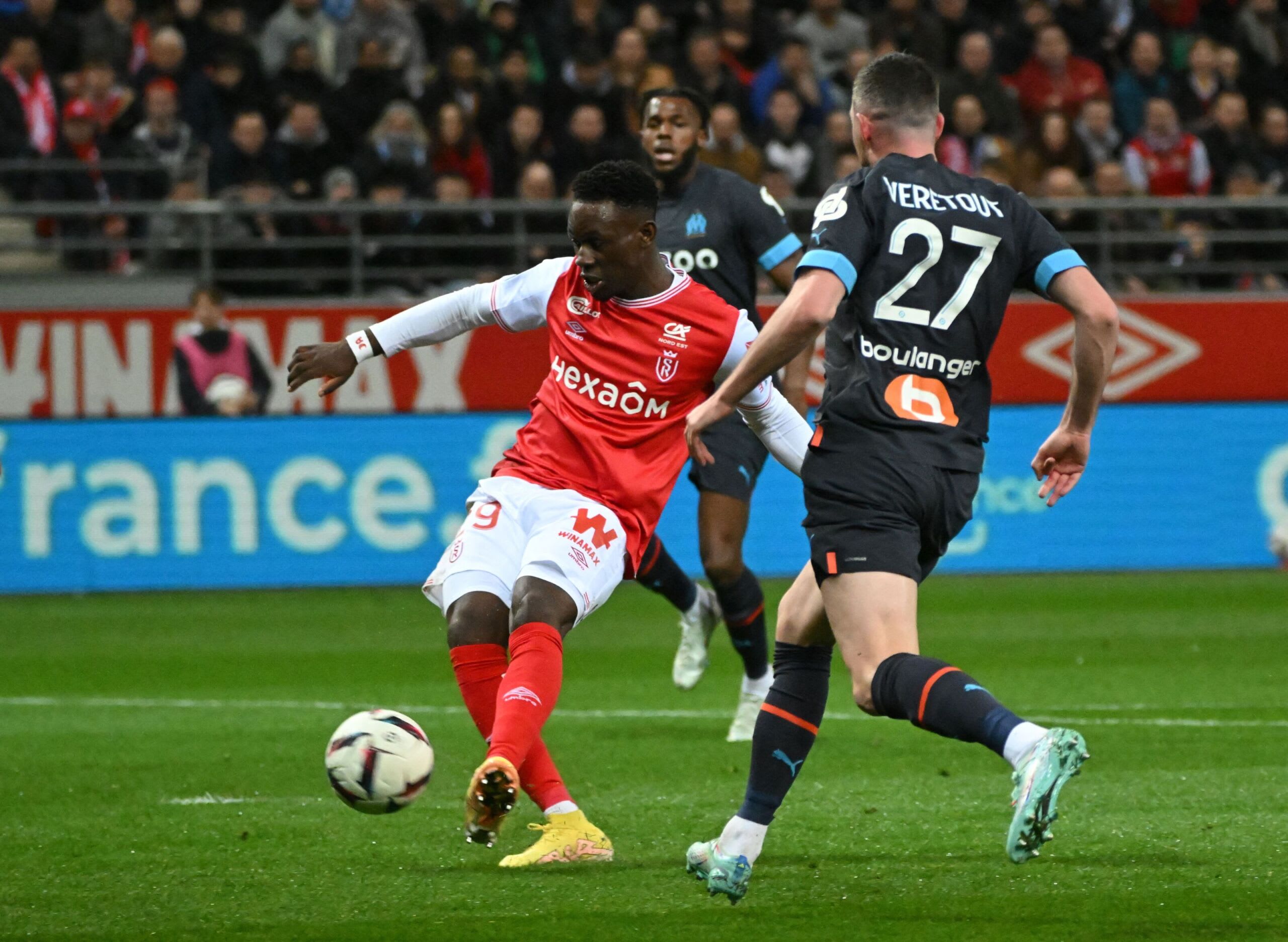 Reims’ English forward Folarin Balogun (L) and Marseille’s French midfielder Jordan Veretout (R) fight for the ball during the French L1 football match between Stade de Reims and Olympique Marseille (OM) at Stade Auguste-Delaune in Reims, northern France on March 19, 2023. (Photo by FRANCOIS LO PRESTI / AFP) (Photo by FRANCOIS LO PRESTI/AFP via Getty Images)