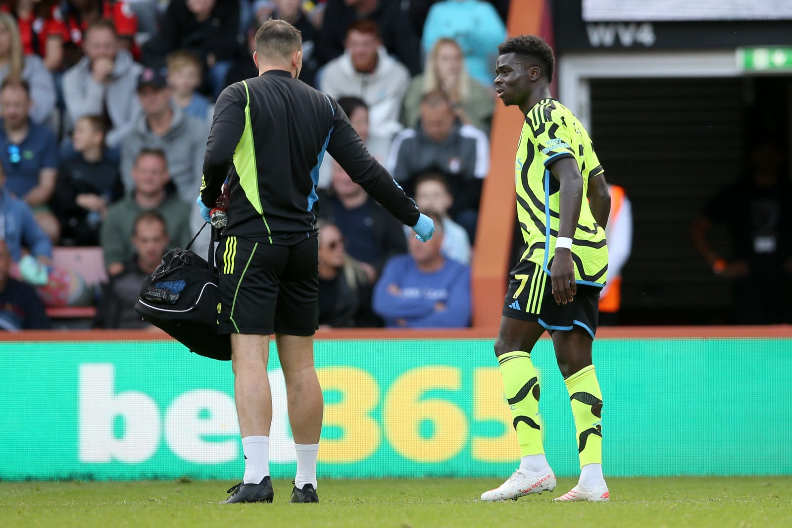 Saka hobbled off in the second half. (Photo by Steve Bardens/Getty Images)